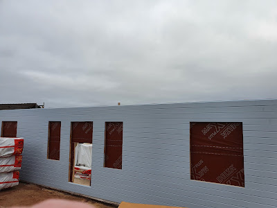 Hier sieht man jetzt auch die vorher gefertigten Fenster. Gestern wurde schon Richtfest gefeiert.